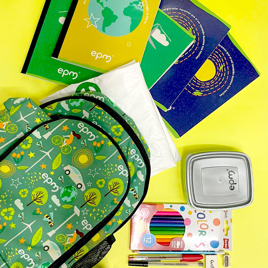 Kit escolar EPM con variedad de utiles escolares, incluye 5 cuadernos, 1 borrador, 1 sacapuntas, 1 set de colores x 12 unidades, 1 lapiz, 1 lapicero rojo, 1 lapicero negro, 1 termo, 1 sanduchera y una carpa impermeable. Este kit viene con morral EPM y cartuchera.