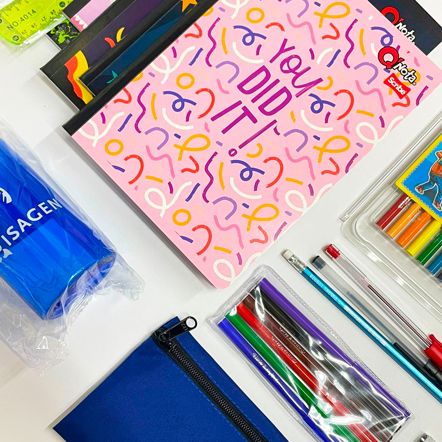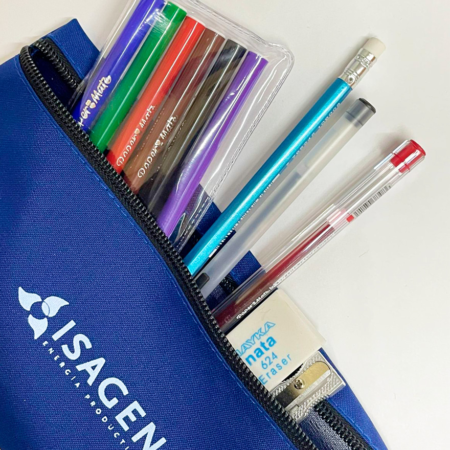 Kit escolar Isagen con variedad de útiles escolares, incluye 5 cuadernos, 1 regla, 1 termo, 1 borrador, 1 sacapuntas, 1 set de colores x 12 unidades, 1 lápiz y 1 lapicero negro, 1 lapicero rojo, 1 set de plumones x 6 unidades. Este kit viene con morral Isagen y cartuchera.