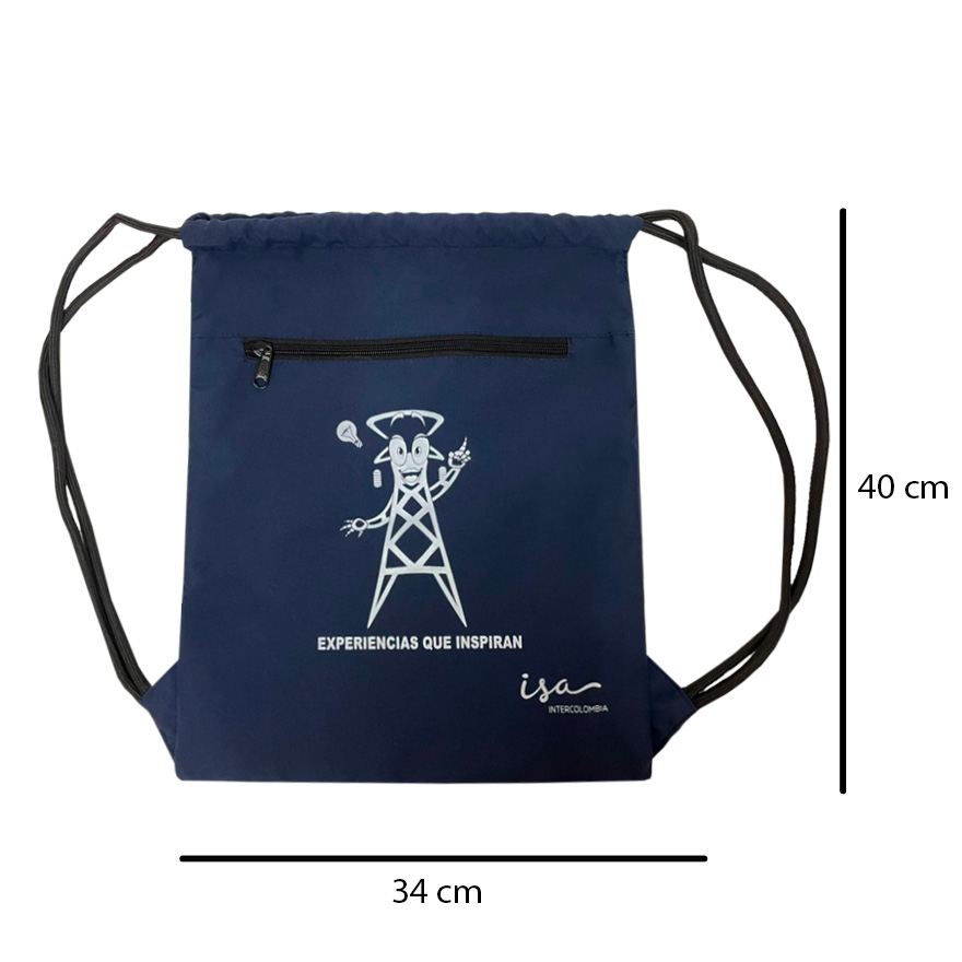 Tula práctica corporativa con estampado fabricada en poliéster, es liviana, fácil de limpiar. Cuenta con un organizador principal, un bolsillo auxiliar frontal de cierre en cremallera y cordones que aseguran el compartimento más grande y sirven de correa para llevar en la espalda.