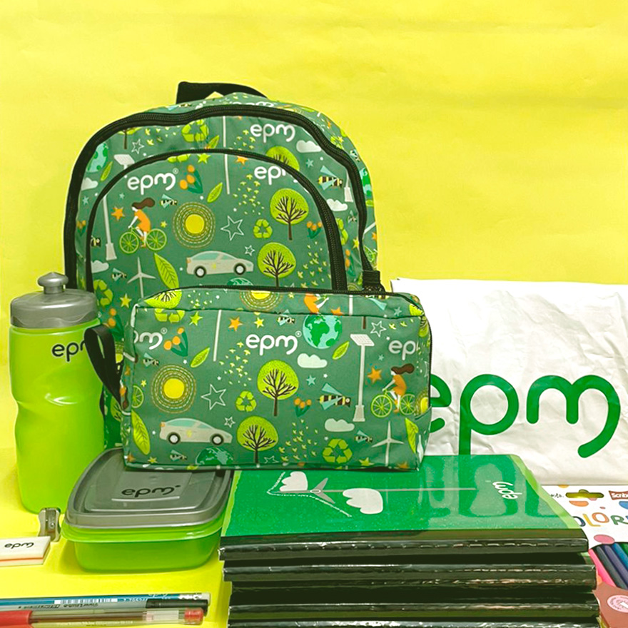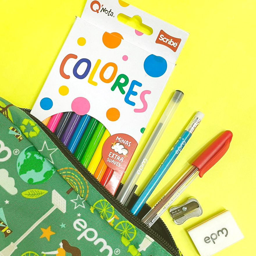 Kit escolar EPM con variedad de utiles escolares, incluye 5 cuadernos, 1 borrador, 1 sacapuntas, 1 set de colores x 12 unidades, 1 lapiz, 1 lapicero rojo, 1 lapicero negro, 1 termo, 1 sanduchera y una carpa impermeable. Este kit viene con morral EPM y cartuchera.